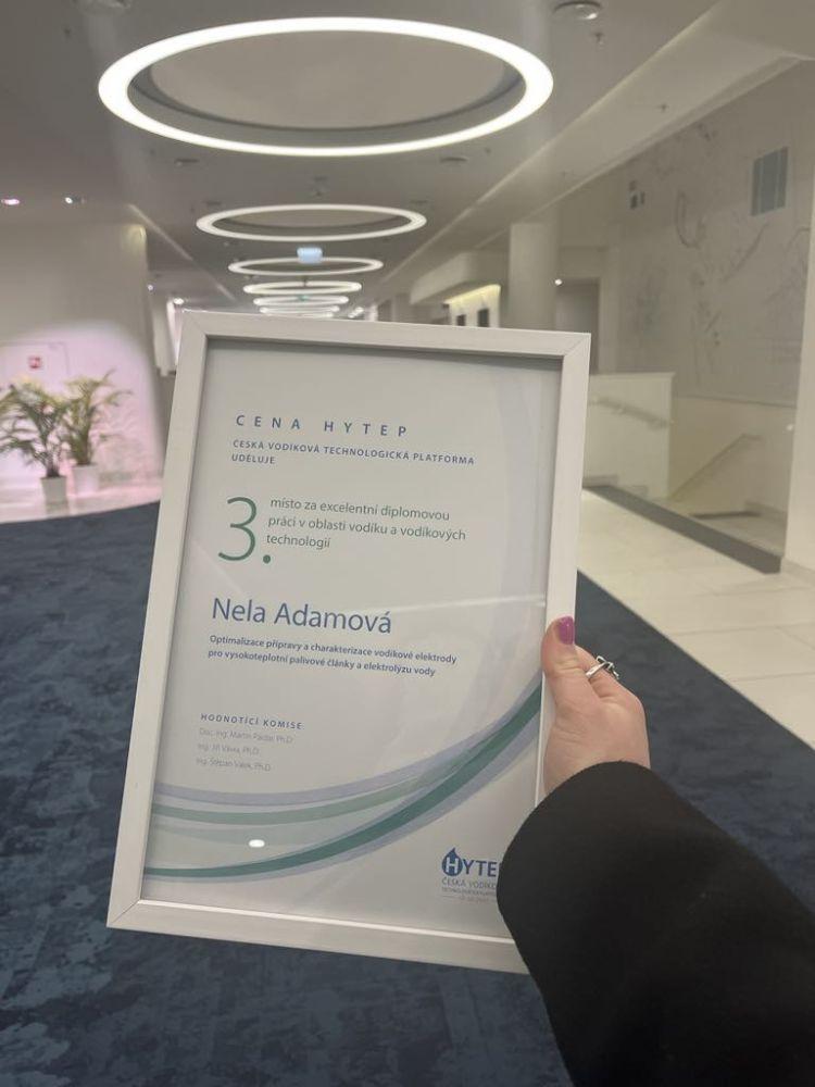 Ing. Nela Adamová won the HYTEP prize for her excellent diploma thesis "Influence of electrolyte composition on solid oxide cell properties" in the field of hydrogen and hydrogen technologies. This prize was awarded during the Hydrogen Days 2024 conference, which took place on 20-22 March 2024 in Prague.