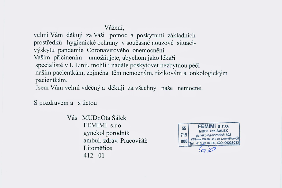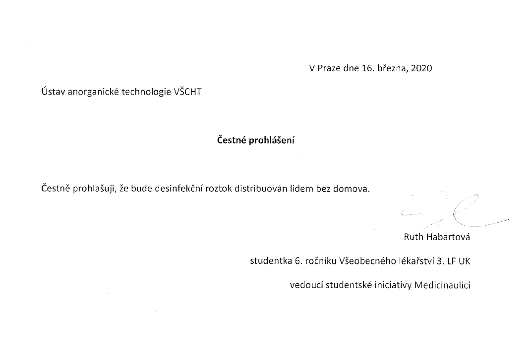 Našim dobrovolníkům se podařilo poskytnout desítky litrů desinfekce gynekologické ambulanci v Litoměřicích, ordinaci ženského lékaře v Lovosicích, Centru sociálních služeb Naděje Broumov, Záchranné službě ASČR , Zdravotnické záchranné službě hl. města Prahy, či iniciativě Medicinaulici, pomáhající lidem bez domova, a dalším.
