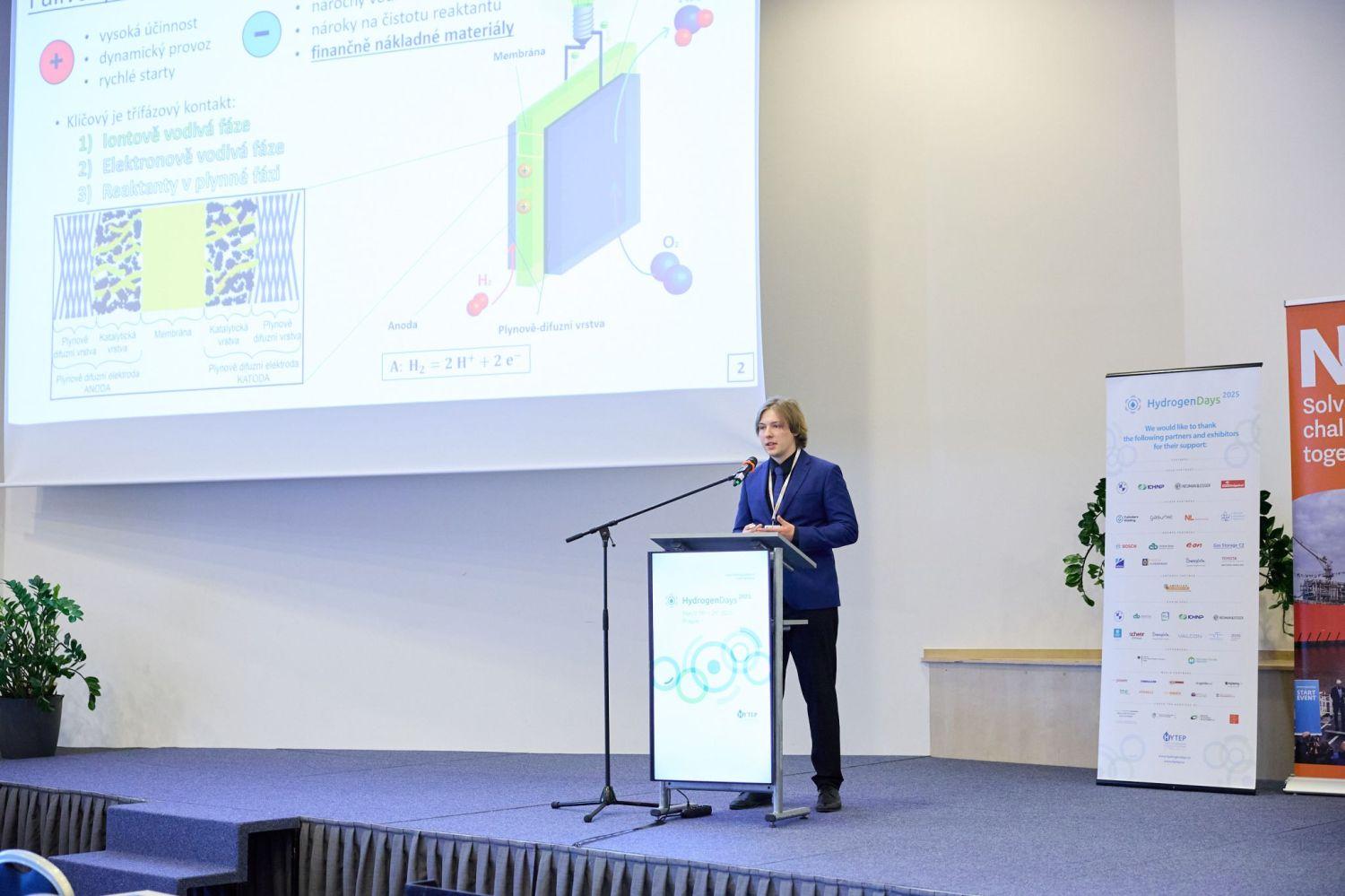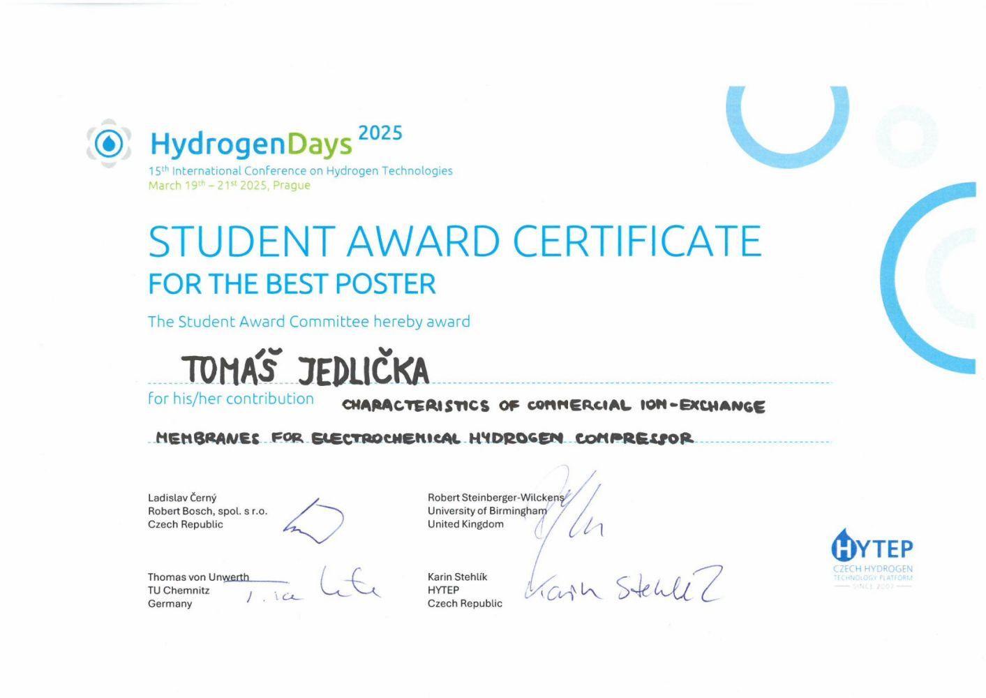 Ing. Tomáš Jedlička získal cenu HYTEP za excelentní diplomovou práci "Inkjet-printed catalyst layers for PEM fuel cells" v oblasti vodíku a vodíkových technologií. Tato cena byla udělěna v rámci konference Hydrogen Days 2025, která proběhla ve dnech 19.-21. března 2025 v Praze. Ing. Tomáš Jedlička byl na této konferenci oceněn i za nejlepší poster ve studentské sekci.
